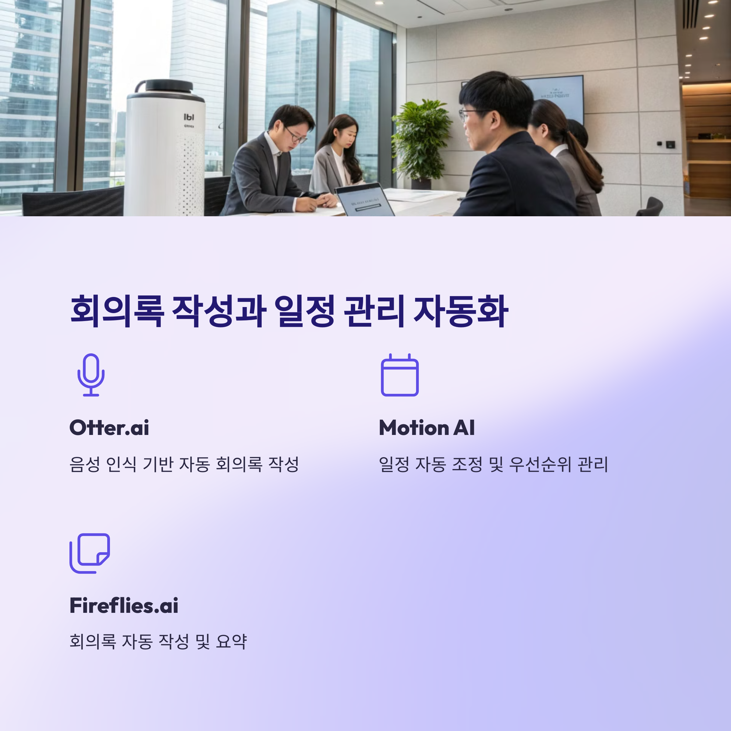 회의가 끝난 후 회의록을 작성하는 것은 시간이 많이 걸리는 작업입니다. AI 회의록 도구를 사용하면 자동으로 음성을 텍스트로 변환하고, 주요 내용을 요약해 줍니다. 또한 일정 관리 AI는 팀원들과 일정을 조율하고, 미팅 시간을 자동으로 추천해 주어 업무 부담을 줄여 줍니다.
